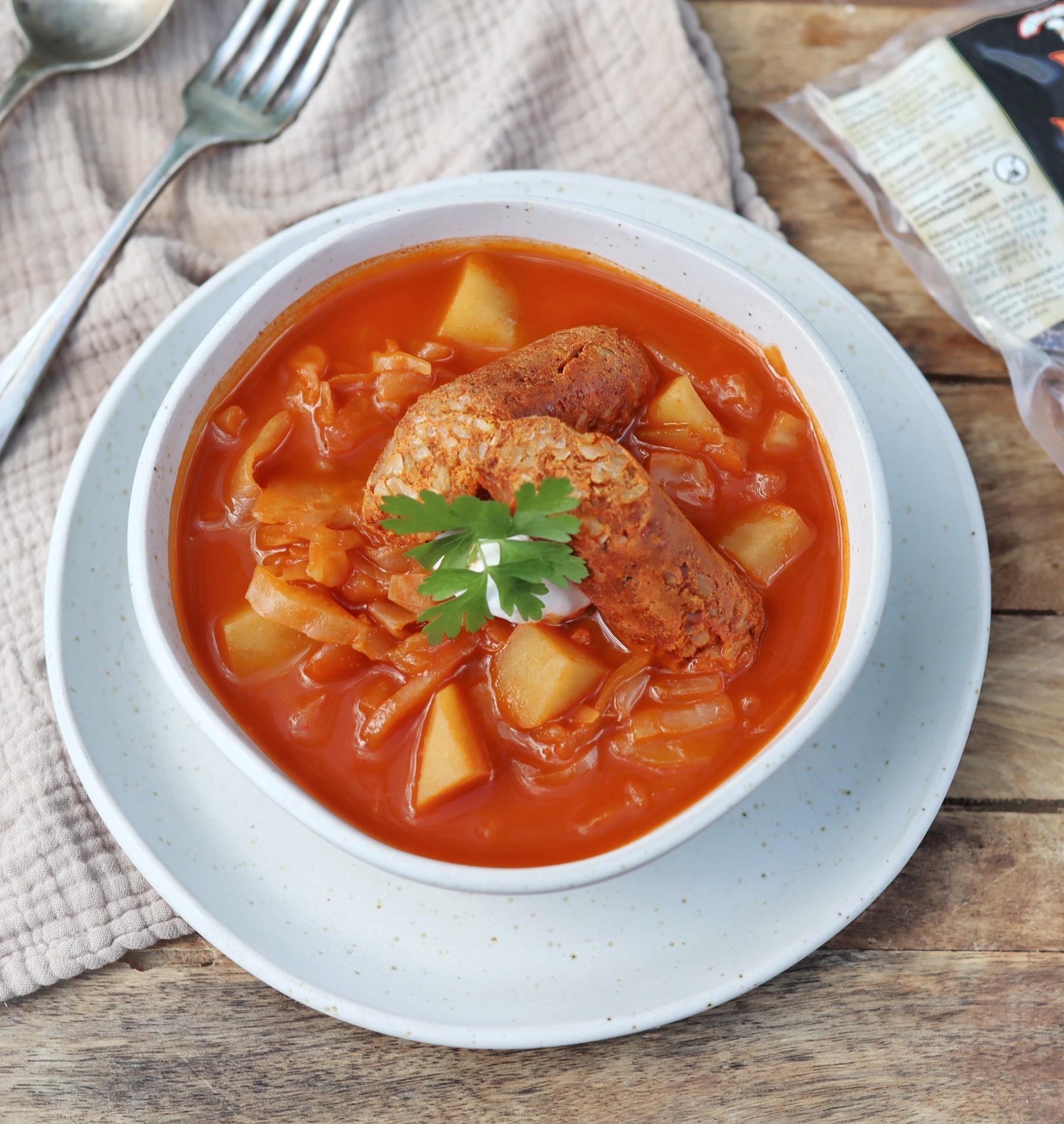 Paradicsomos káposzta krumplival és vegán Csicseri Grillerrel egy ízletes, tartalmas fogás, amelyben a paradicsomos alap remekül kiemeli a fűszeres feltéteket.