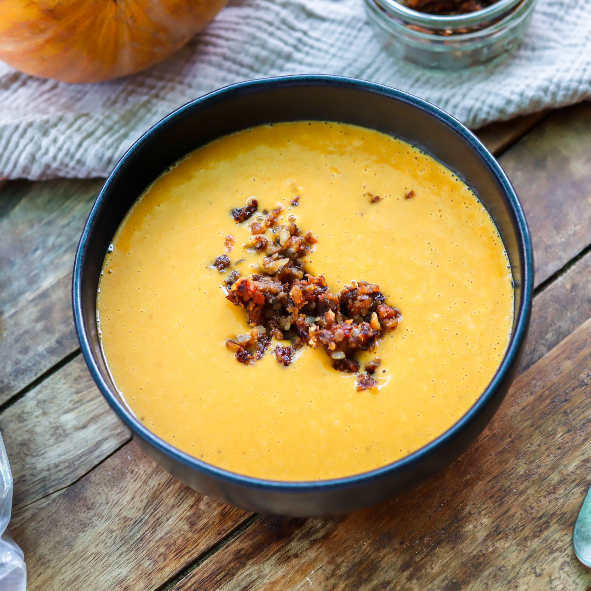 Krémes sütőtökkrémleves, ahol a sült tök édeskés alapját a gochujangos, ropogós morzsa teszi izgalmasabbá és kontrasztossá.