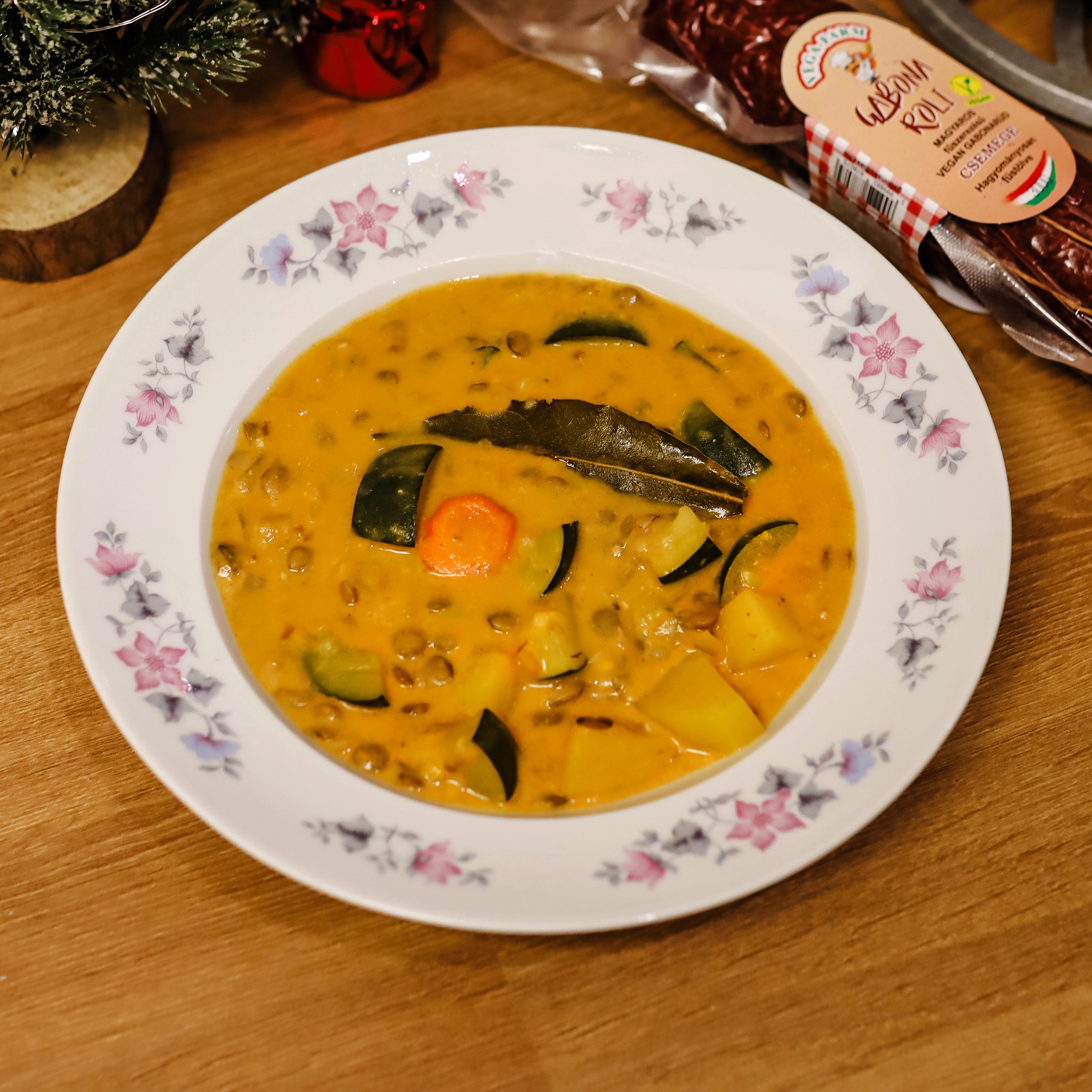 Amikor a burgonya és a répa majdnem megpuhult, hozzákeverjük a főtt lencsét, lefedjük, és további 10 percig főzzük. Ha szükséges, közben kevés vizet adunk hozzá.
