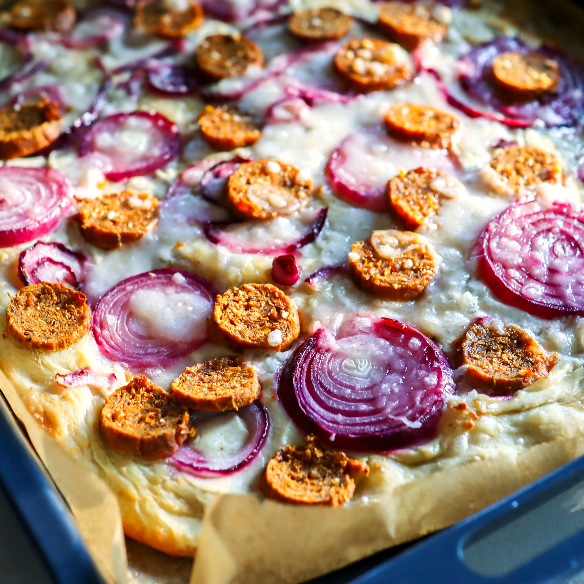 5. Szórd rá a lilahagymát, és a felszeletelt Piknik Rúdat.